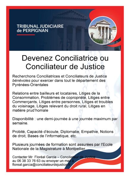 Le tribunal judiciaire de Perpignan recherche des Conciliatrices et conciliateurs de Justice bénévoles (renseignements complémentaires sur l’affiche ci-joint).